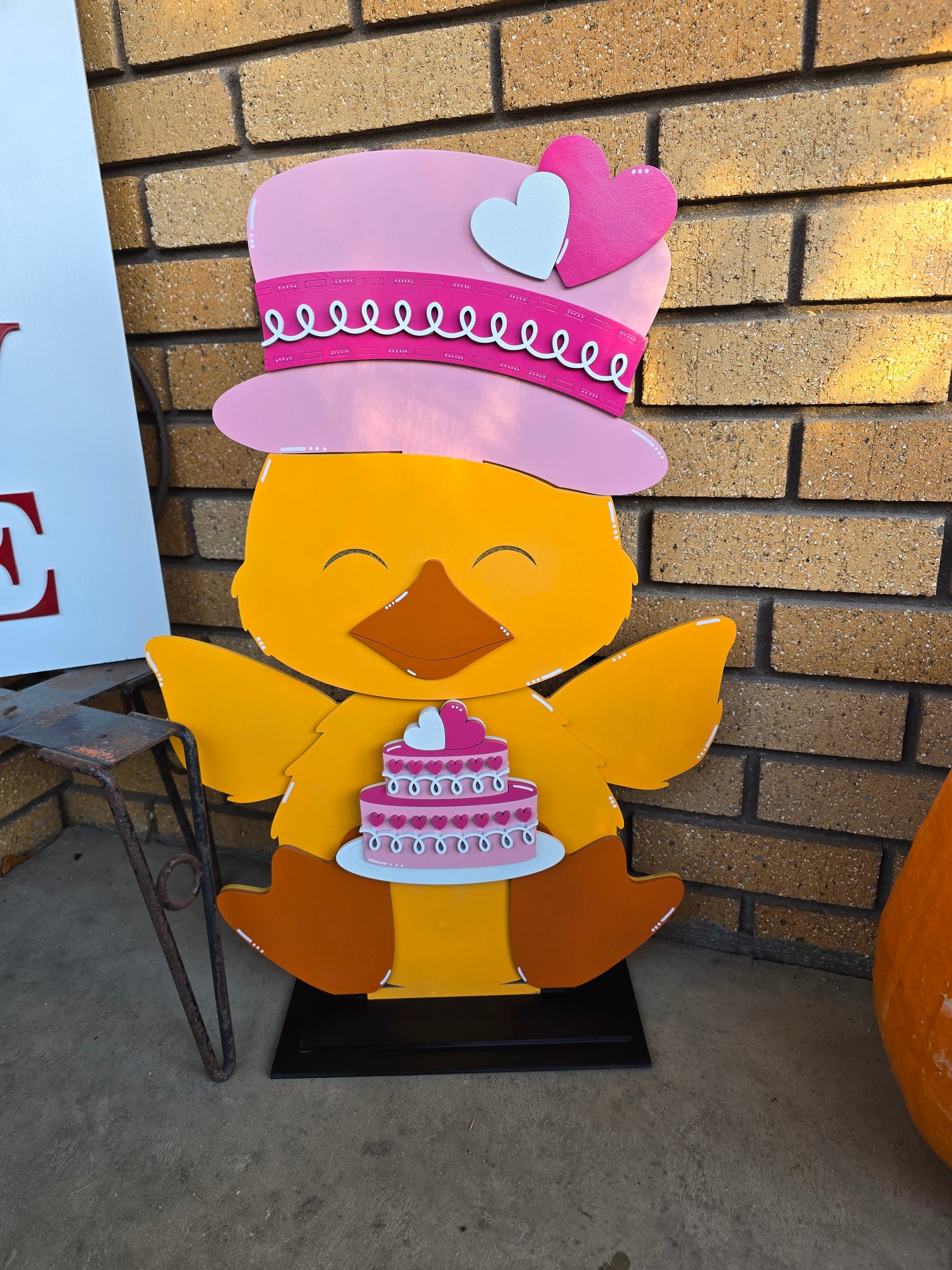 This cute duck is over 25" tall depending on the hat and almost 22" wide. This would be so cute on a porch or inside.